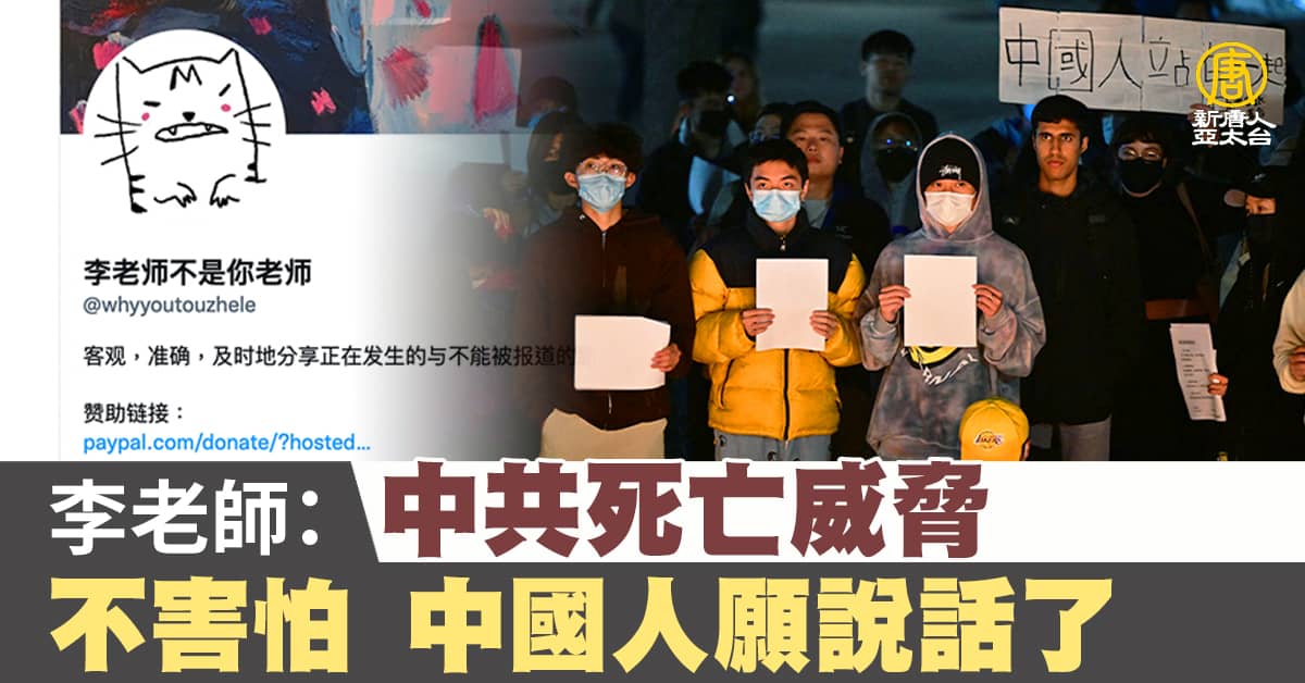 化名「李老師」的中國年輕人來自安徽,2015年移居義大利,「李老師」說,先前他一直不敢在網上公開批評中共,不過,北京四通橋事件給了他勇氣。白紙運動發生後,「李老師」協助發布中國集體抗爭畫面,每隔幾分鐘就發文,有時每晚只睡兩個小時。同時,他遭受死亡威脅,在安徽的父母,四度被中共公安找上,自11月底以來,他的推文已獲得超過13億次瀏覽,「李老師」說,真正偉大是敢於站出來的人,他只是被歷史選中的記錄者,未來會用這個帳號繼續扮演監督角色。