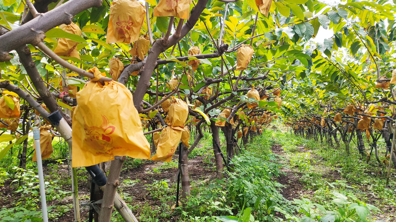 田間已套紙袋的果實,在低溫來臨前加套塑膠袋;或是在迎風面架設高度1.8公尺以上遮風網,保護範圍約下風處13公尺,依序再架設,以降低冷風的影響,減少裂果。