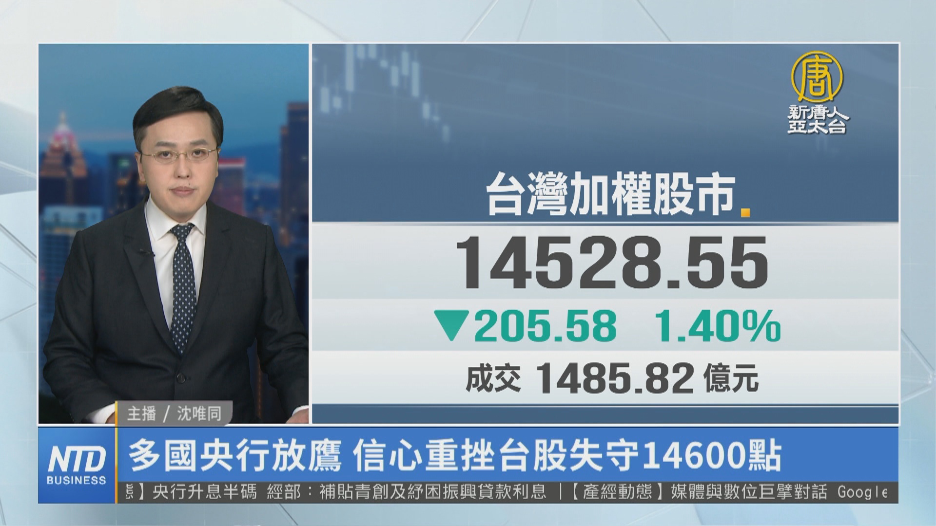 【新唐人亞太台 2022 年 12 月 16 日訊】新聞一開始帶您關心股市,美國11月零售銷售數據,不如市場預期,加上美國聯準會暗示,降息時間將延後到2024,此外,歐洲、英國及瑞士央行,同步升息2碼,都暗示未來不排除繼續升息,市場氛圍是更加沉重。美股三大指數重挫,台股周五開低走低,早盤一度摜破14500關卡,台積電下跌9.5元,以471元作收,加權指數持續走弱,收在14528點,下跌205點。三大法人中外資持續賣超,投信也是轉買為賣,市場震盪加劇也可能影響下周一股市表現。