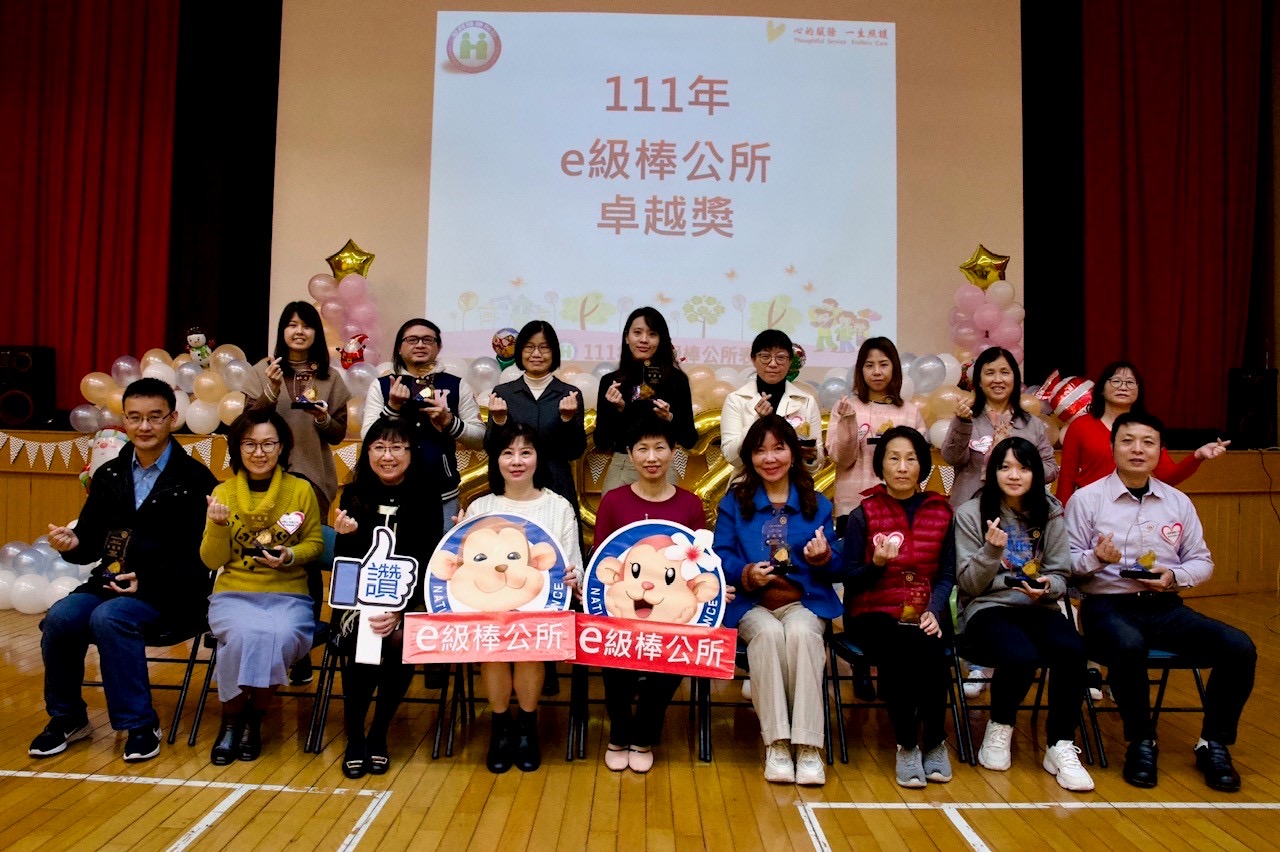 健保署北區業務組張温温組長(前排中)頒獎給13家e級棒公所。(中央健康保險署北區業務組提供)