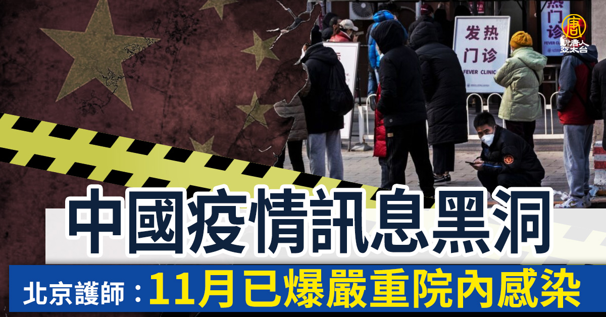 中共當局一直對外隱瞞大陸中共病毒疫情(COVID-19)的真實狀況,日前,北京某三甲醫院一名主管護師披露,早在11月中旬,其所在醫院已發生嚴重疫情,近半數醫護人員染疫。但醫院系統坦言,疫情最嚴峻時刻未到。有港媒評論指出,中國疫情已經進入「訊息黑洞」,包括死亡人數可能是個難以究竟的「黑洞」。