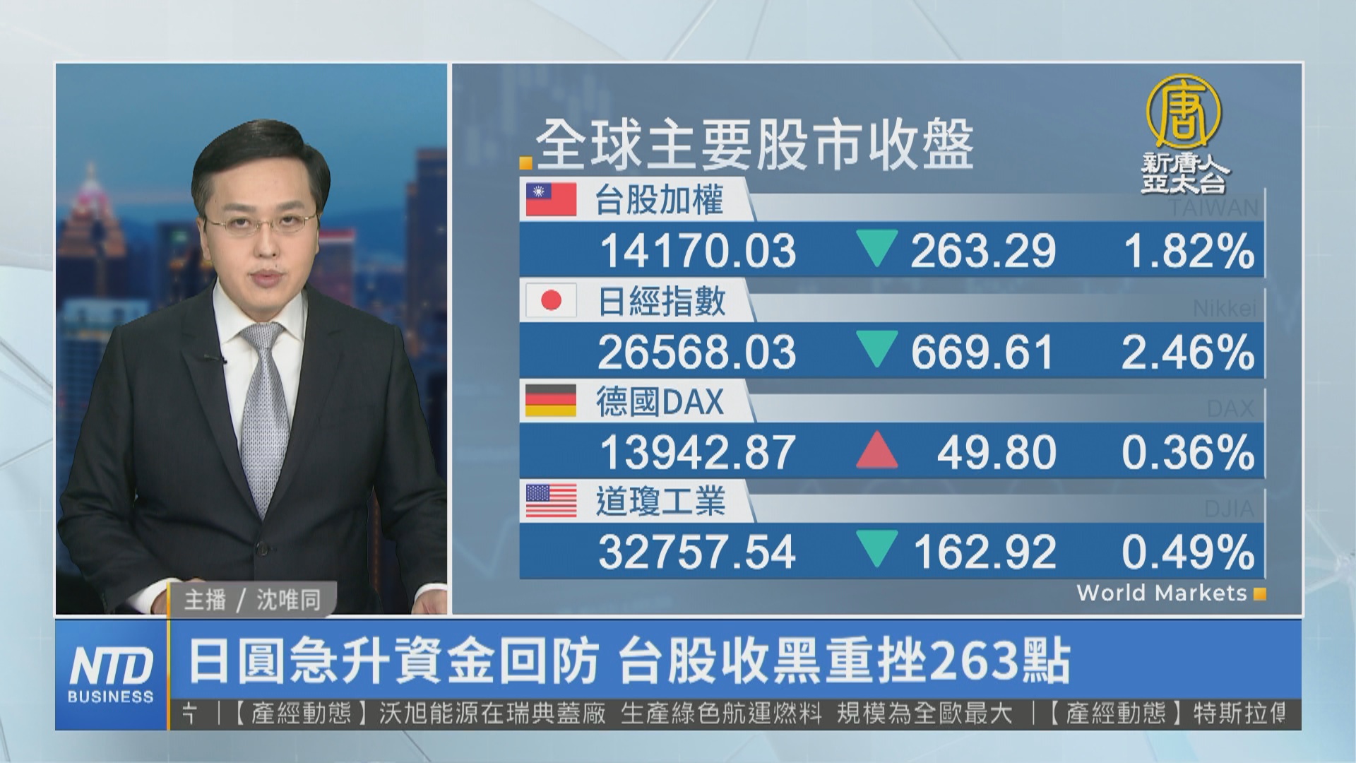 【新唐人亞太台 2022 年 12 月 20 日訊】新聞一開始帶您關心股市,美股周一科技股、金融股持續收低。因應高通膨,各國央行紛紛跟進美國聯準會升息政策,日本央行周二宣布,提高10年期日本公債殖利率上限區間,引發日圓急升,全球資金快速挪移,台股今天盤中跌幅擴大,台積電下殺11.5元觸及455元,終場台股收在14170.03點,下跌263.29點。市場觀望氣氛擾動下,三大法人再度賣超181.53億。