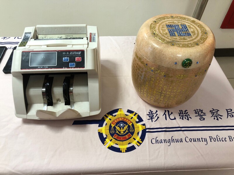 傅男組詐騙集團,以靈骨塔買賣為名義謊稱有買家以高價收購,詐騙民眾購買靈骨塔等,不法所得近千萬元。圖為警方查扣骨灰罈與點鈔機。 (圖/彰化縣警察局提供)