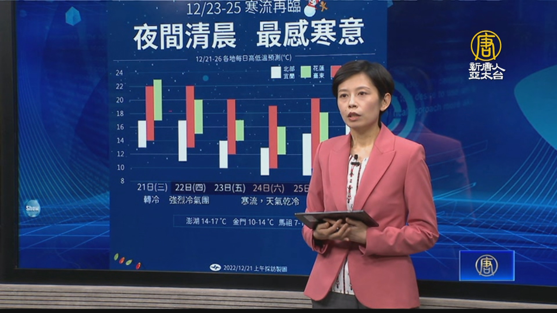 【新唐人亞太台 2022 年 12 月 21 日訊】關心台灣天氣,明天12月22日是冬至,在這團圓日前夕,受到冷空氣南下影響,今天(21日)各地越晚越冷,氣象局更新低溫特報,傍晚到明天,高雄以北局部地區,嚴防攝氏10度以下低溫,而且要連凍四天到週日聖誕節!週六、週日是這波冷空氣,最冷的時候,有機會達到寒流等級,西半部、東北部低溫下探9度。