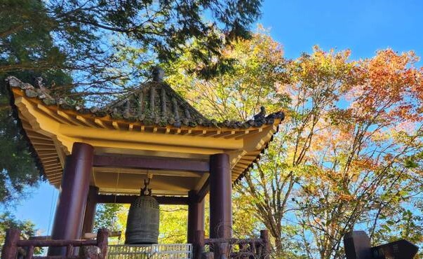 嘉義林區管理處23日指出,阿里山慈雲寺古鐘樓前青楓透著陽光映照出綠黃橙紅漸變色彩,美不勝收,值得一遊。(圖/嘉義林管處提供)