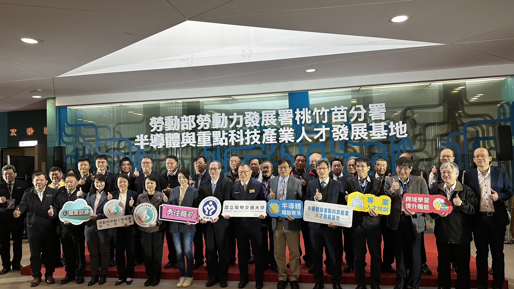 勞動部勞動力發展署桃竹苗分署與國立陽明交通大學合作辦理「半導體與重點科技產業人才發展基地」,今天(23日)正式揭牌。(勞動部桃竹苗分署提供)