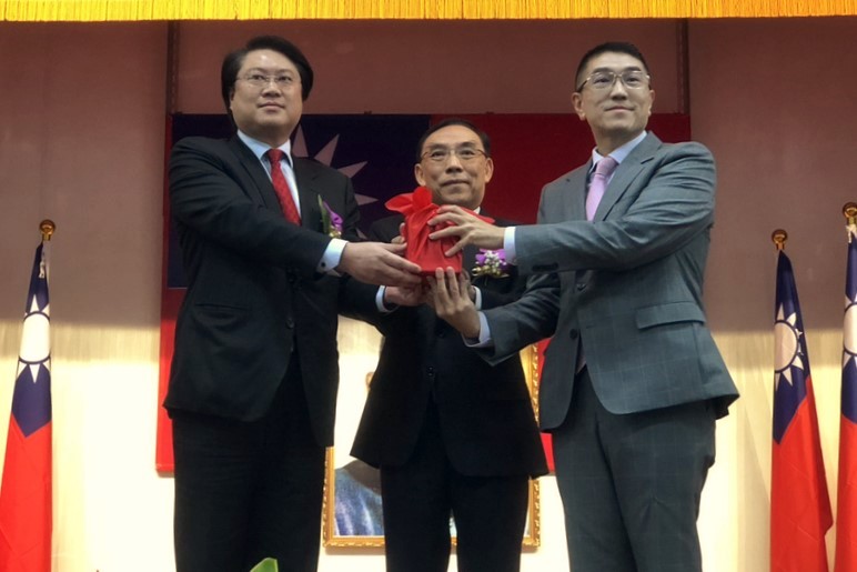 第19屆基隆市長就職典禮25日上午在基隆市政府舉行,由法務部長蔡清祥(中)擔任監交人,卸任市長林右昌(左)將印信交給新任市長謝國樑(右)。(圖/中央社)