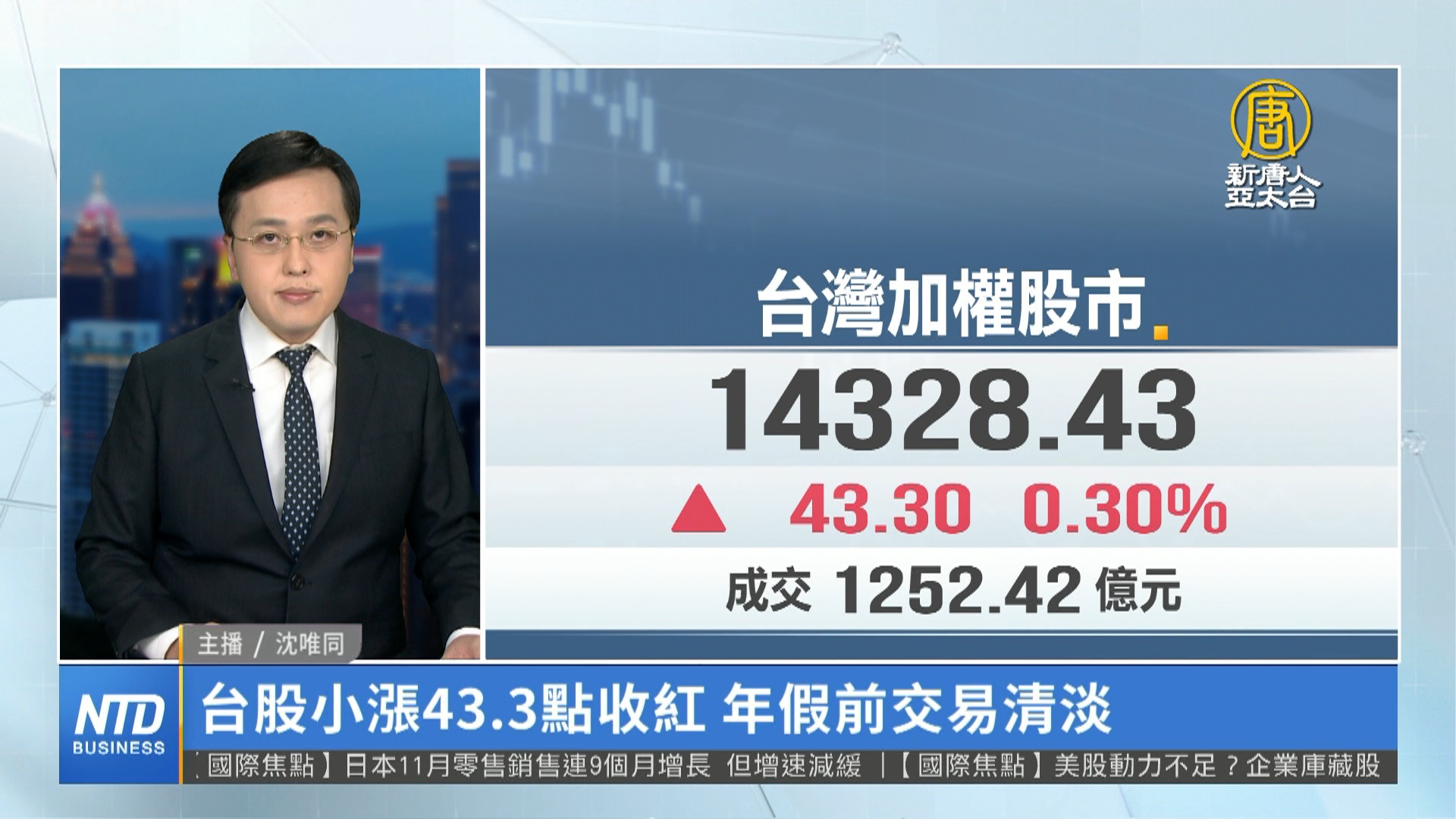 【新唐人亞太台 2022 年 12 月 27 日訊】新聞一開始帶您關心股市,美股周一因耶誕節補假休市,美股指數期貨電子盤上揚,亞洲股市周二反彈,尤其2022年封關僅剩四個交易日的情況下,台股今(27日)早盤隨日韓股開高,台積電開盤漲1.5元至458元隨後漲到459.5元,帶動集中市場表現,不過中午過後,權值股賣壓再度湧現,台股只維持小漲局面,最後以14328.43點收市,上漲43.3點,而且成交量也維持低量的1200億。