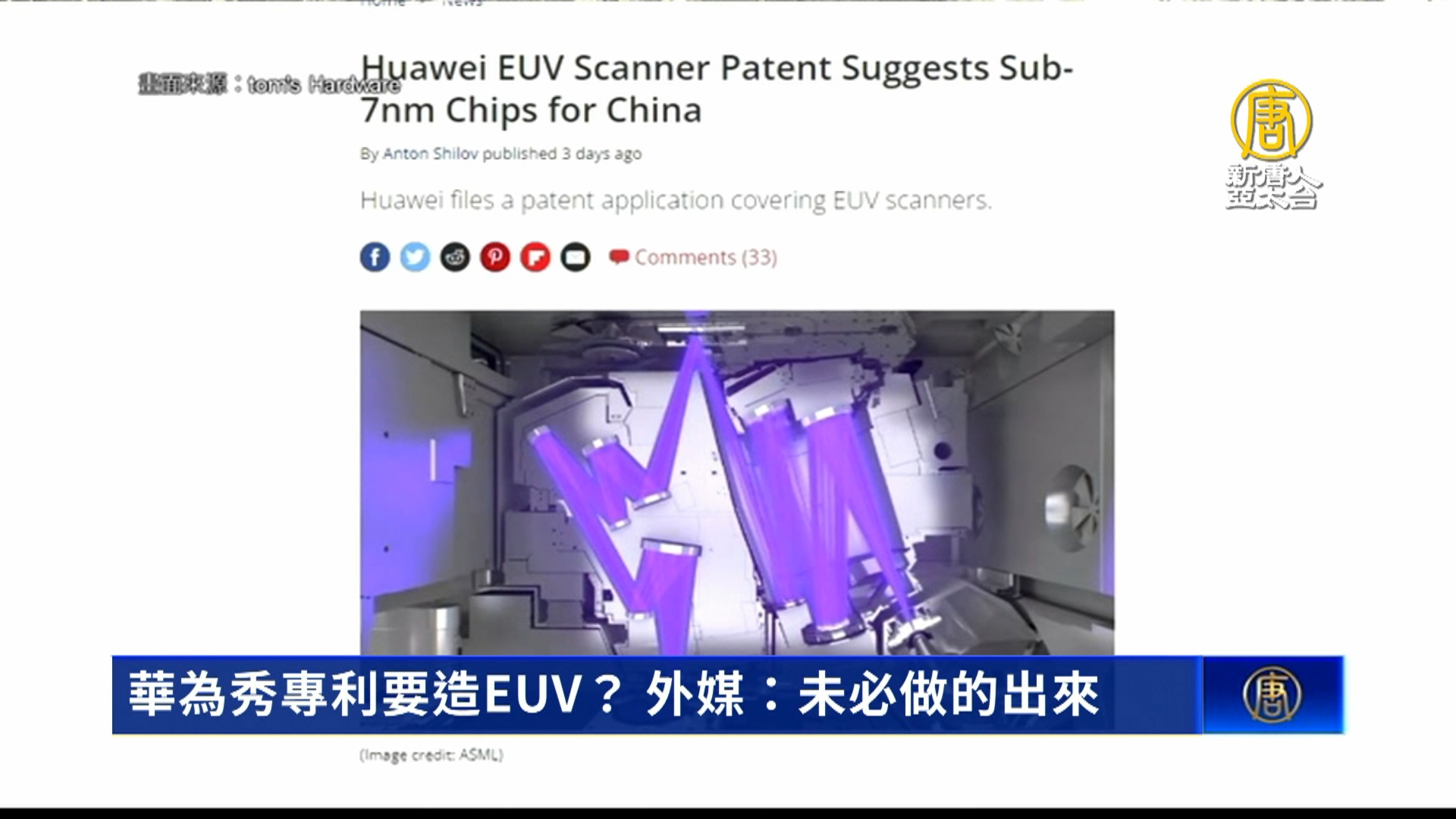 【新唐人亞太台 2022 年 12 月 27 日訊】華為日前公開,極紫外光(EUV)新技術專利,外界分析這是華為將投入光刻機研發的訊號,用來製造高階製程7奈米以下晶片。不過全球知名硬體網站《Tom's Hardware》報導指出,EUV光刻機非常複雜,不是申請幾項專利就能造出,一台EUV光刻機有超過10萬個先進零組件,需要相關上下游產業鏈配合。很多公司都試圖開發EUV,最後只有 ASML 經過10多年努力,才取得成功。