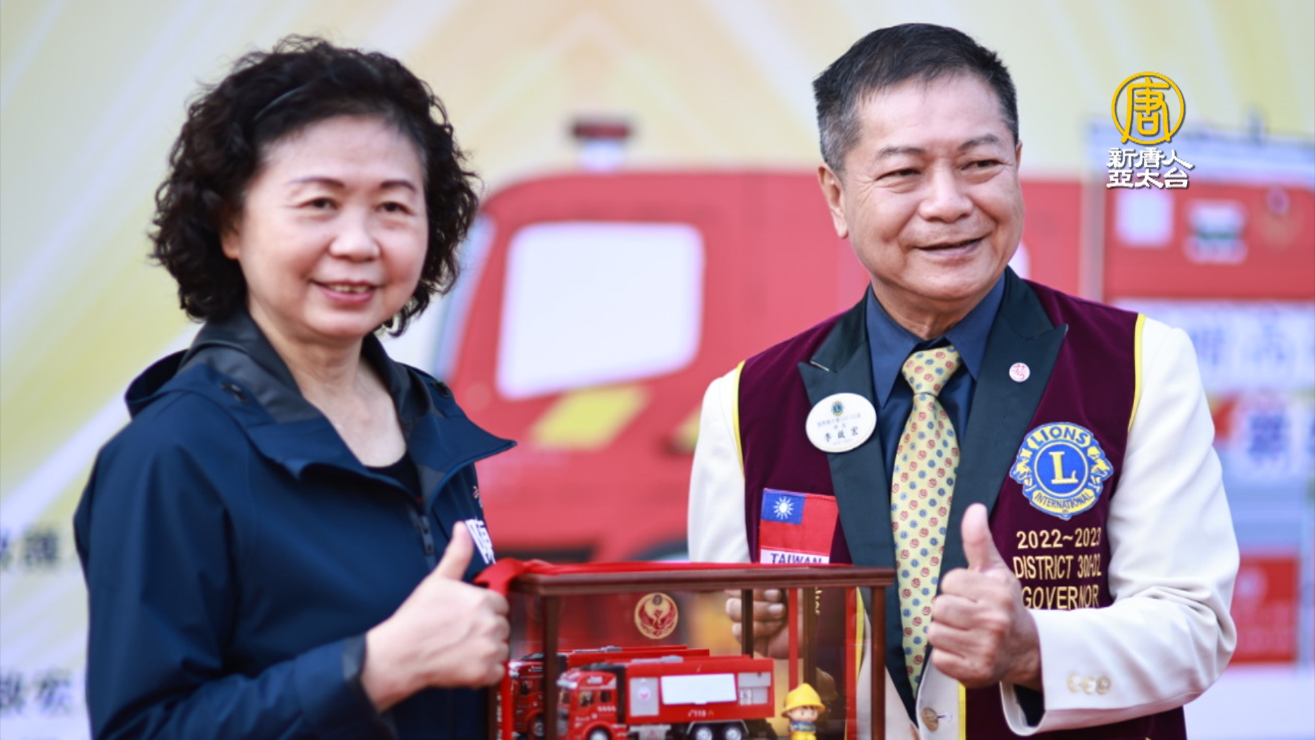 【新唐人亞太台 2022 年 12 月 27 日訊】國際獅子會300-D2區為落實「啟動服務 宏振獅譽」的年度主題,體現獅子會關懷社會福祉、人溺己溺之人道精神,24日在高雄市消防局第四救災救護大隊辦理,捐贈賓士10噸單艙雙排座水箱消防車一輛,加強對社區及保護民眾生命財產。