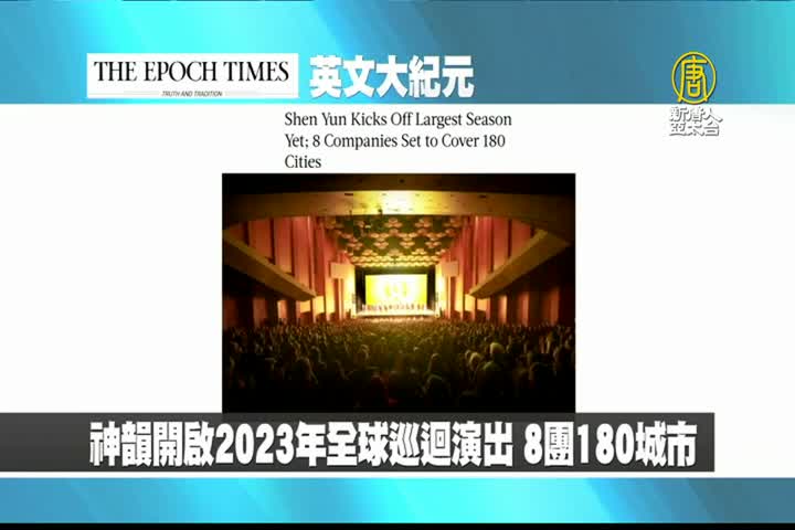 【新唐人亞太台 2022 年 12 月 29 日訊】首先來看到美國大紀元英文版報導:總部在紐約的神韻藝術團,開啟2023年全球巡迴演出,8個團將到訪180座城市,是歷年規模最大。