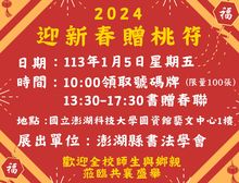 2024-01-04 14:15:11澎湖科技大學(以下簡稱澎科大)圖書資訊館藝文中心,將於5日下午1點30分到5點30分,舉辦「2024迎新春贈桃符」春聯贈送活動,歡迎全校師生與社區民眾一同前往共襄盛舉。