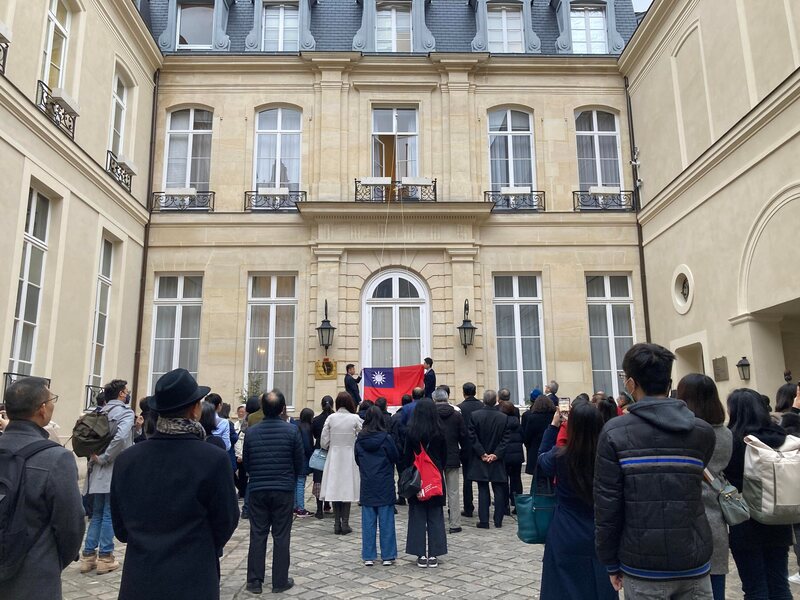 駐法國代表處於1日上午10時在代表處中庭舉辦慶祝中華民國112年元旦升旗典禮,近百名參與者共同迎接2023年曙光。(圖/駐法國代表處提供)