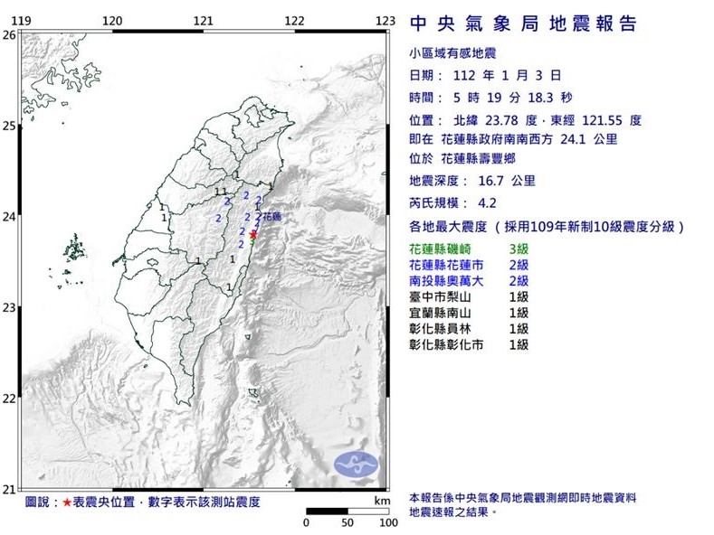 今晨5時19分又發生規模4.2地震,震央位於花蓮縣壽豐鄉,深度16.7公里,花蓮縣最大震度3級,南投縣2級,台中市、宜蘭縣、彰化縣1級。