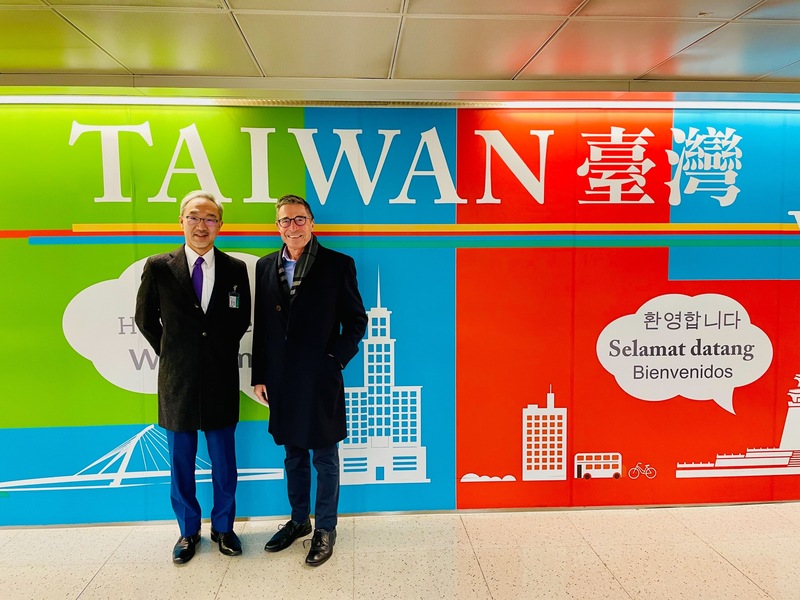 曾任北大西洋公約組織(NATO)秘書長的民主聯盟基金會主席拉斯穆森(圖右)3日清晨抵台訪問,外交部歐洲司長姚金祥前往接機。 (圖/外交部提供)