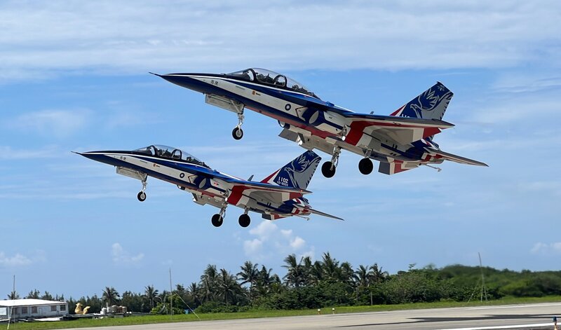 空軍勇鷹新式高教機10架進駐台東志航基地的計畫達標,這幾天開始一連串測試、訓練。圖為2022年7月6日2架次勇鷹高教機升空展示。(圖/中央社)