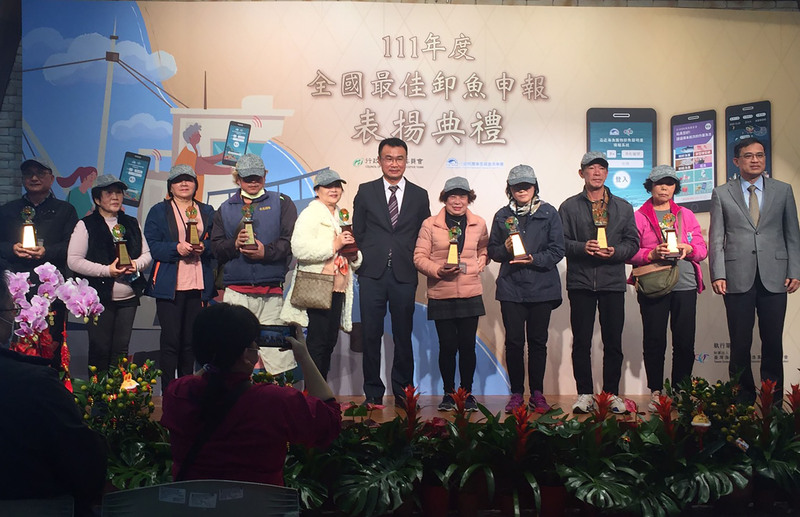 「111年度全國最佳卸魚申報表揚典禮」7日在台北舉行,農委會主委陳吉仲(中)出席表揚獲獎者,並與眾人合影留念。(圖/中央社)
