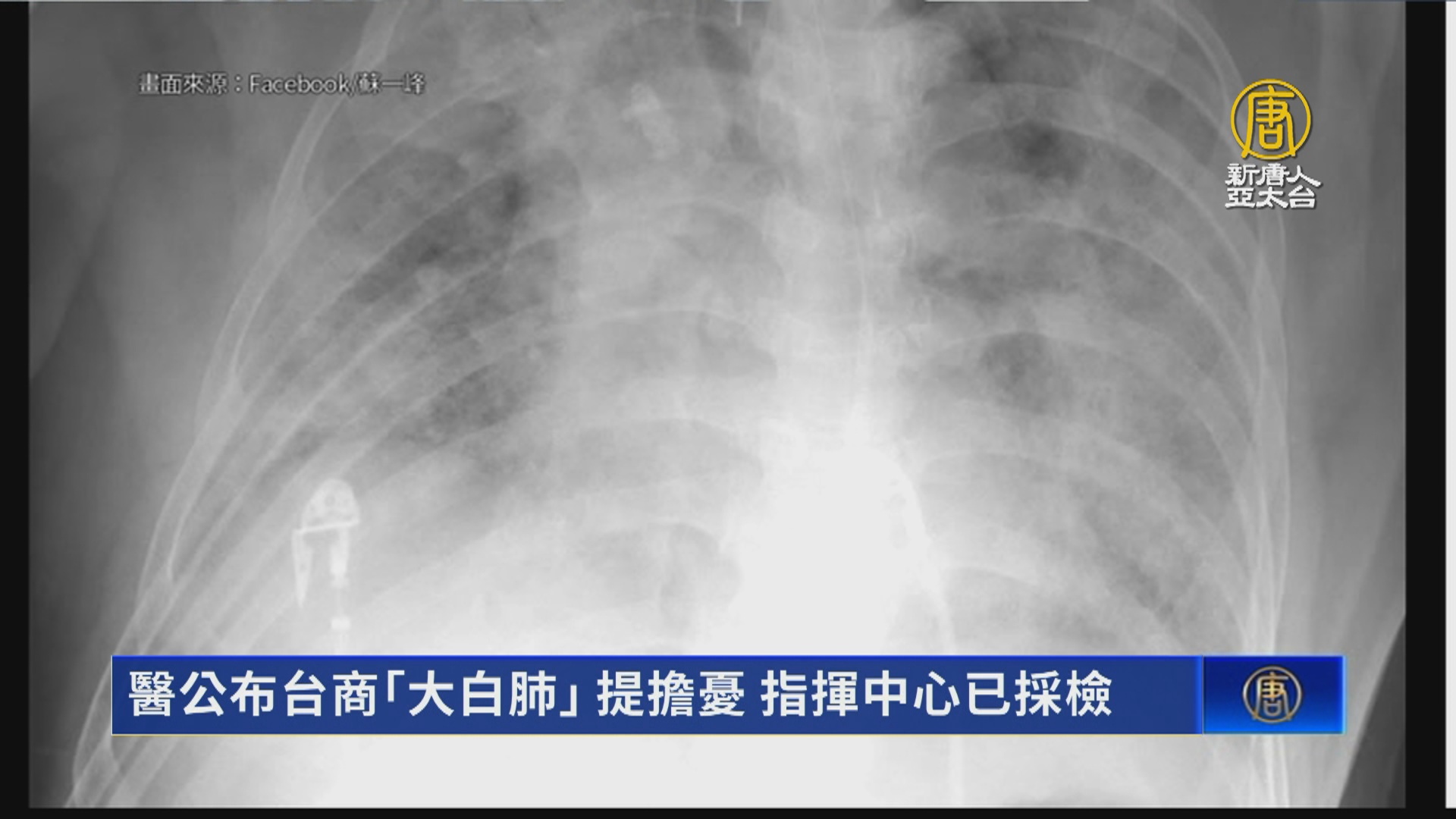 【新唐人亞太台 2023 年 01 月 07 日訊】來看到,中國疫情大爆發,在台灣實施對中國入境班機全面唾液篩檢前,有名台商返台後3天自行篩檢驗出陽性,不過未及時就醫,演變成嚴重肺炎,胸腔X光片整片白茫茫。醫師指出,依這名台商的病況,在醫療量能不足的中國,可能很難活下來。並表示,目前在中國流行的變種病毒,看起來毒性有增加。對此,指揮中心發言人莊人祥今天(7日)回應,疾管署已經收到檢體,若Ct值低於26就會進行病毒基因定序,釐清是何種變異株。