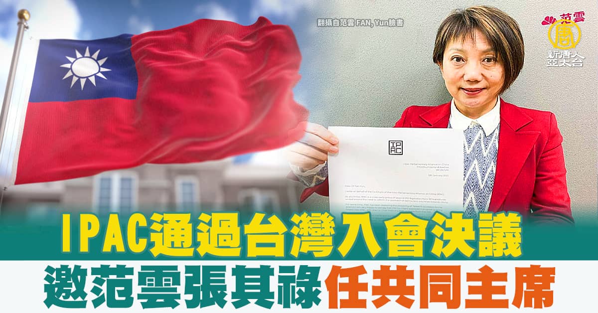 范雲今天在臉書粉絲團發文指出,她昨天收到IPAC的正式來信,IPAC的共同主席團通過讓台灣加入的決議。而IPAC也通過決議,邀請她與張其祿代表各自政黨,擔任共同主席,代表台灣國會議員參與IPAC的決策機制。
