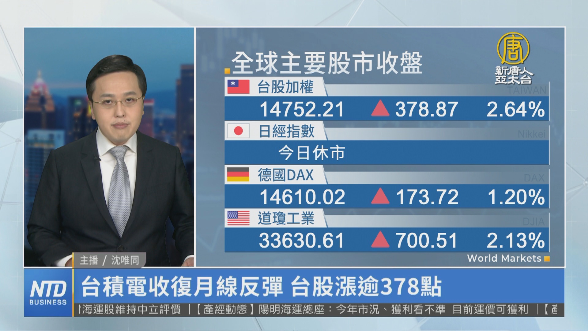 【新唐人亞太台 2023 年 01 月 09 日訊】新聞一開始帶您看到,美國開年第一周,股市表現搶眼,美股周五反彈上揚,激勵亞洲股市表現,南韓股市上揚2.63%,日經225指數漲幅0.59%,台股方面,台積電今天大漲22.5元,創下12月9日以來收盤新高,市值收復12兆元新台幣,帶動台股收在最高點14752.21點,一口氣大漲378.87點,越過14700點整數關卡。