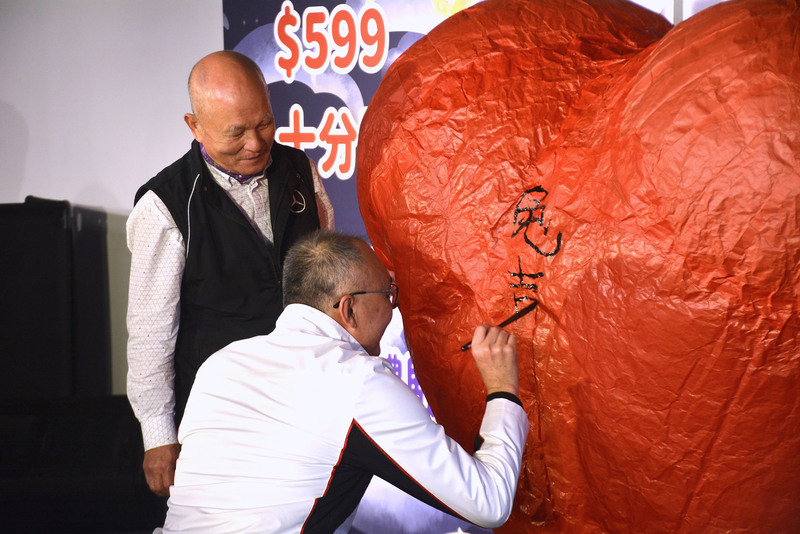 新北市副市長謝政達(圖右)11日出席2023新北市平溪天燈節記者會,現場揮毫在心型天燈上寫下新年吉祥話。左為天燈師傅胡民樹。(圖/中央社)