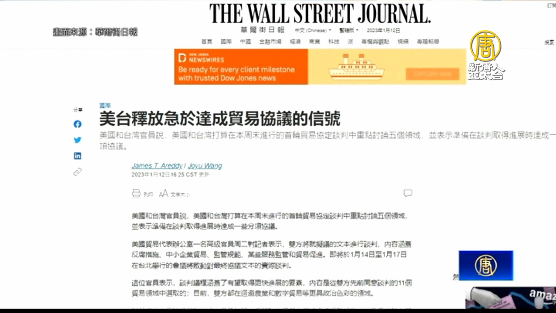 【新唐人亞太台 2023 年 01 月 12 日訊】台美21世紀貿易倡議,去年11月在美國紐約首度舉行談判會議後,雙方決定這周末,將在台北舉行新一回合會議。華爾街日報報導,隨著中共威脅日增,台美雙方都有意願急速推進,台北談判聚焦5個領域,預計將取得一些分項協議。