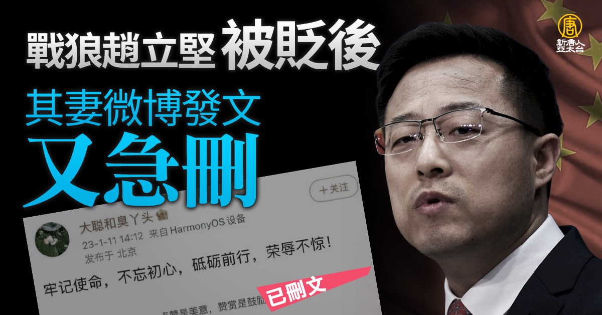 【新唐人亞太台 2023 年 01 月 12 日訊】戰狼趙立堅被貶後 其妻微博發文又急刪