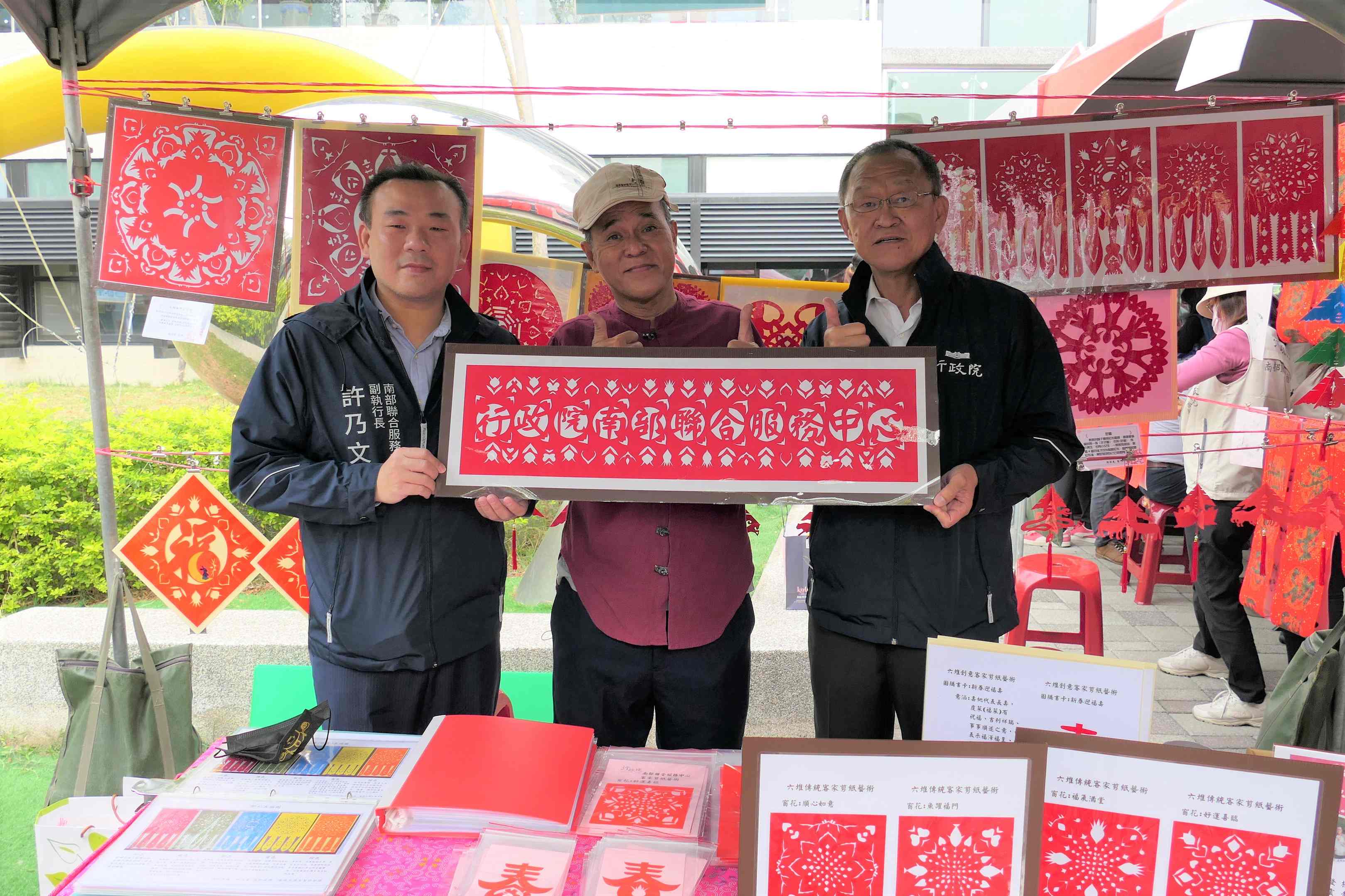 客家剪紙老師陳榮光現場示範剪紙技法,並剪出「行政院南部聯合服務中心」字樣贈與二位副執行長。二天活動免費發贈300份客家窗花與立體書卡給民眾,同時還有總統府春聯及紅包袋可索取。