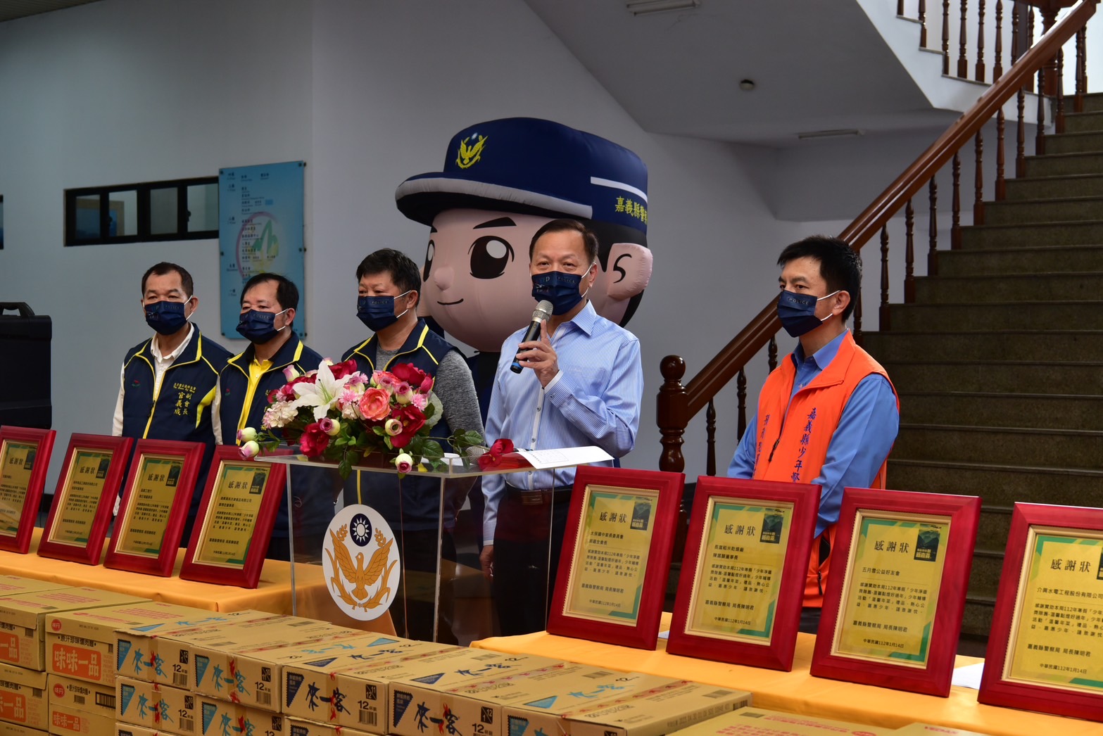 嘉義縣警局副局長詹登燦,今天上午在警局中庭,頒發感謝狀給來自各方熱心公益團體,他們熱心贊助「溫馨年菜」禮品和紅包。(嘉義縣警察局提供)