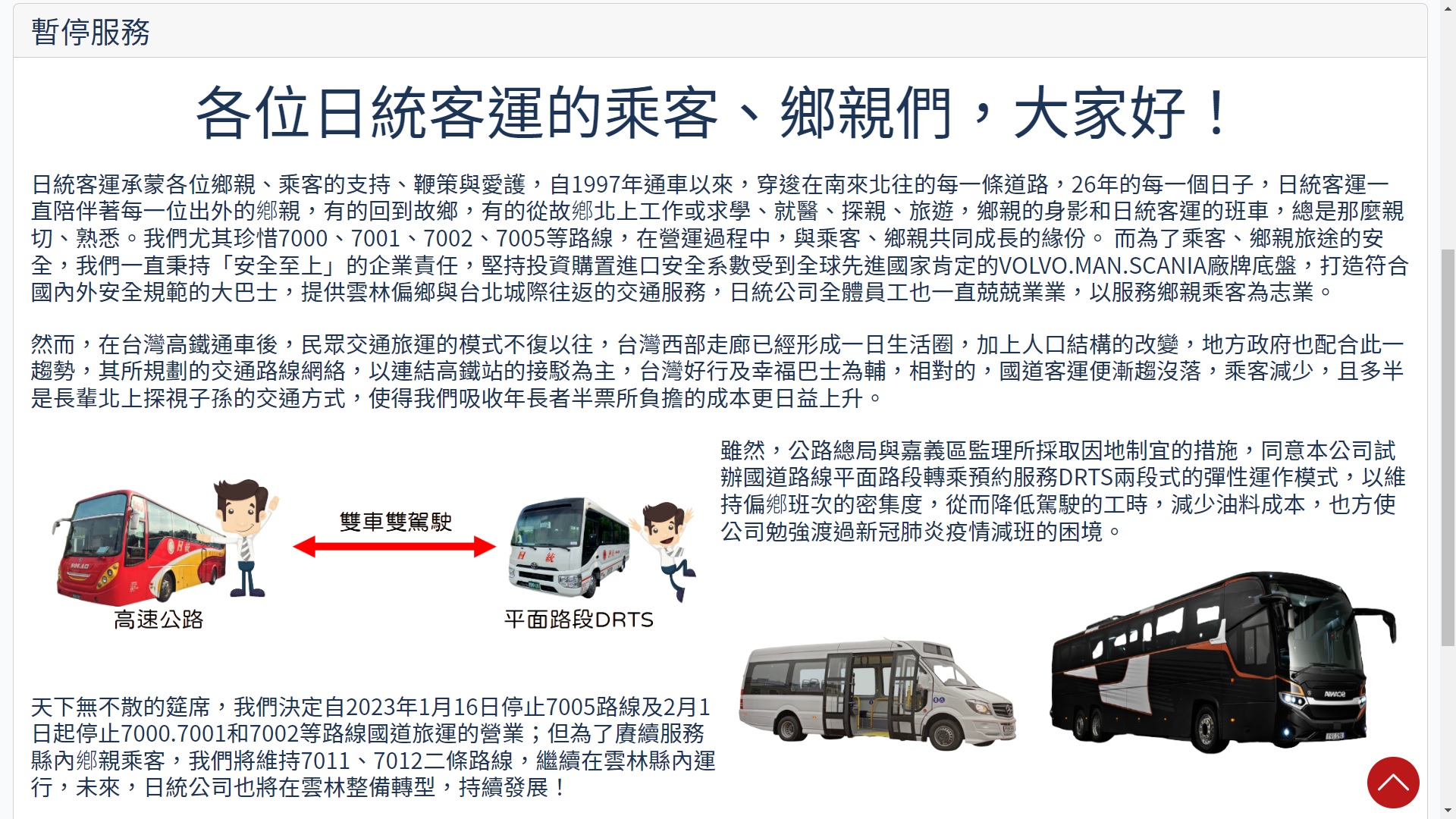日統客運公告指出,16日起停止7005國道路線,2月1日起停止7000斗六至台北、7001北港至台北、7002四湖至台北3條國道路線。(圖/翻攝自日統客運官網)