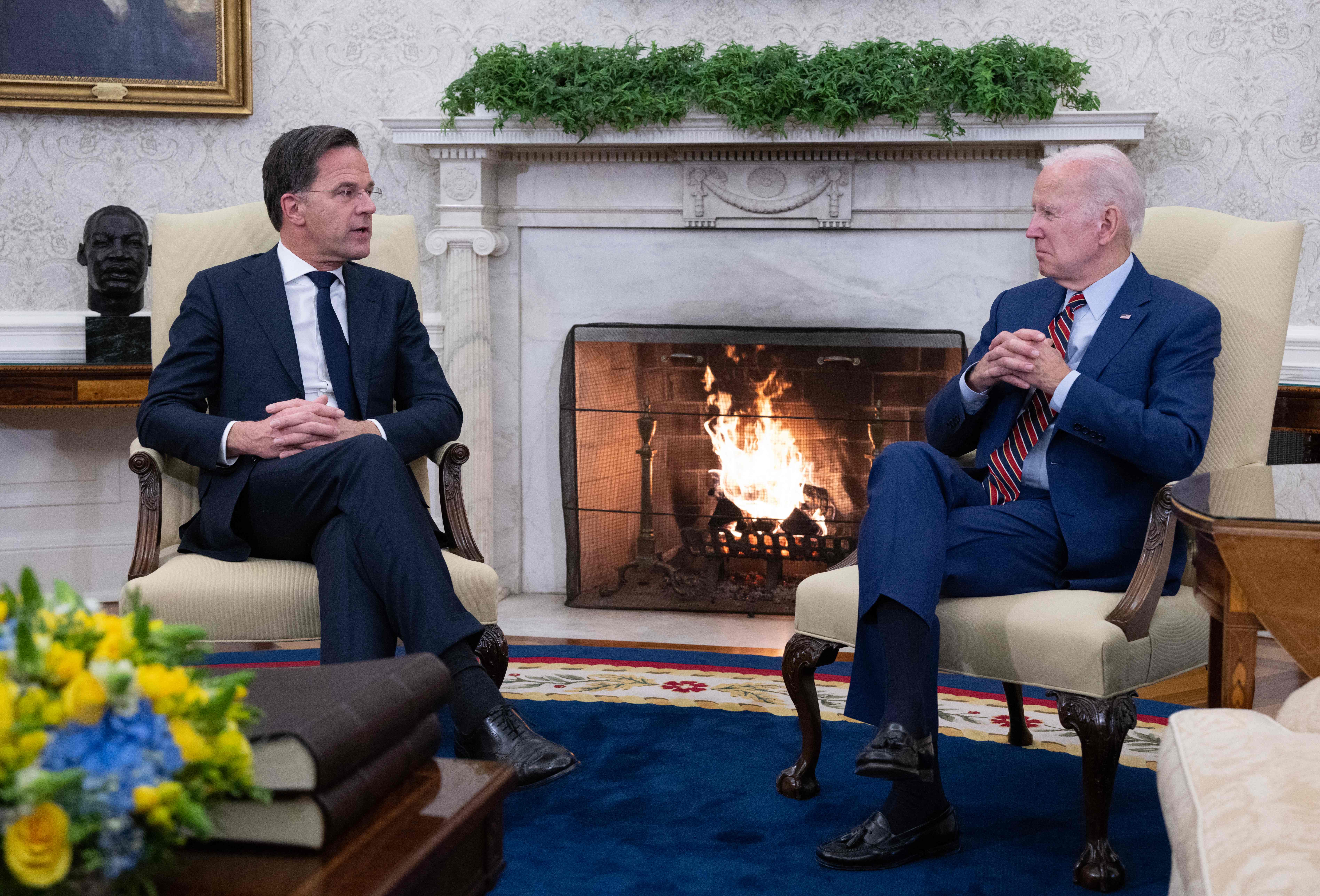 荷蘭總理呂特(左)17日抵達華府,與美國總統拜登(右)會面。(圖/GettyImages)