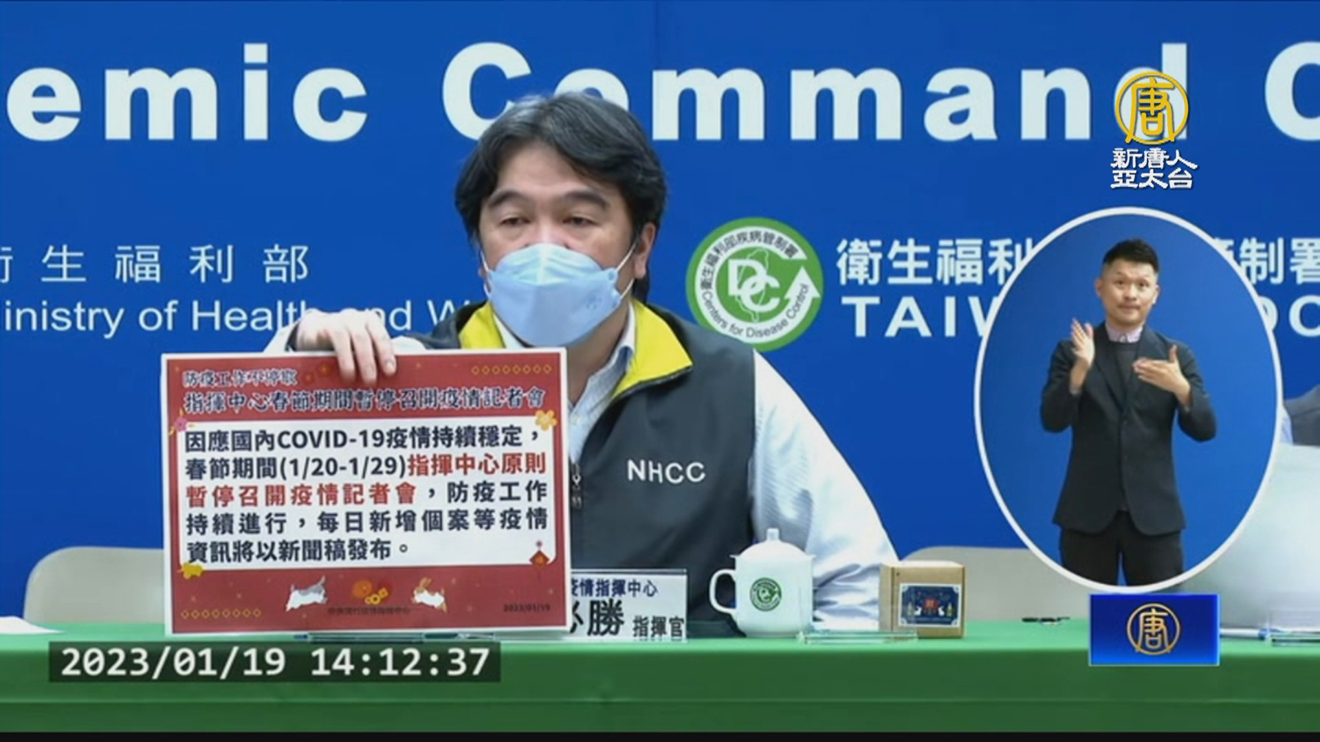 【新唐人亞太台 2023 年 01 月 19 日訊】台灣中央疫情指揮中心,週四召開虎年最後一場的記者會,而過年連假期間,原則上沒有記者會。指揮中心也宣布啟動過年專案,全台近200家醫院,將在過年期間,進行視訊門診。