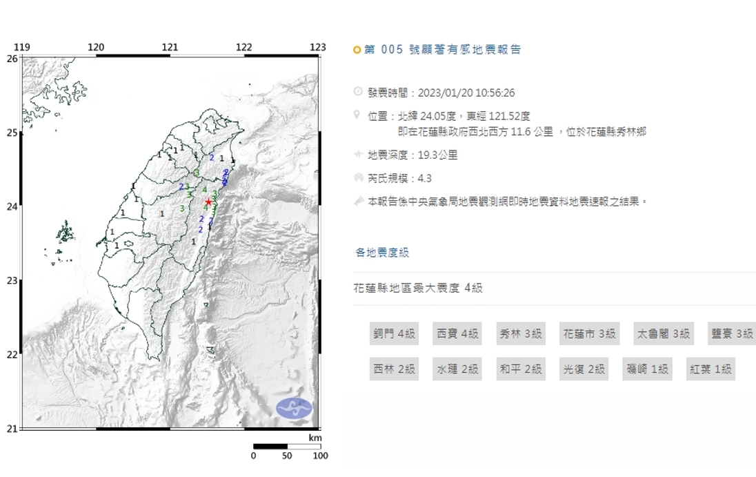 【新唐人亞太台 2023 年 01 月 20 日訊】根據中央氣象局最新資訊,今天上午10時56分發生芮氏規模4.3地震,地震深度19.3公里,震央位於花蓮縣政府西北西方11.6公里(位於花蓮縣秀林鄉),最大震度花蓮縣4級。