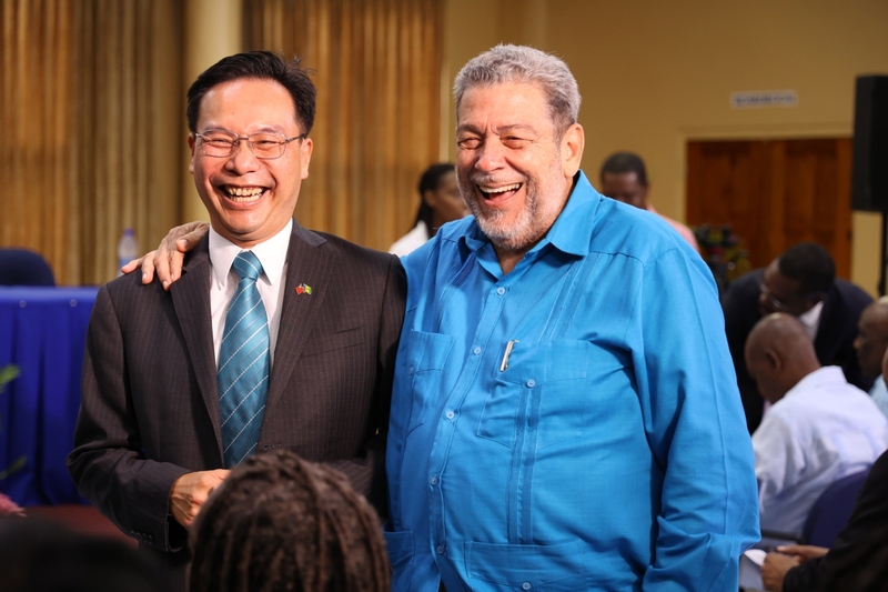 根據駐聖文森大使館新聞稿,藍夏禮今天與龔薩福(Ralph Gonsalves)在聖國首都京斯鎮(Kingstown)共同主持「青年就業補助計畫」記者會。