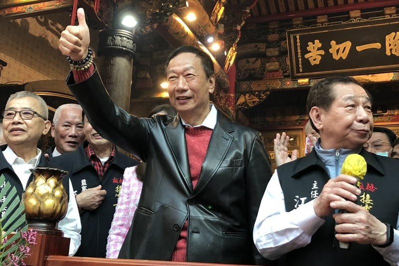 鴻海集團創辦人郭台銘於22日上午參拜板橋接雲寺,媒體關注是否可能出來選2024年總統。郭台銘會後受訪表示,老百姓期待領導人可以保持台灣的和平,帶台灣走向經濟繁榮、杜絕貪污,參拜時詢問神明,讓神明來做決定。(圖/中央社)