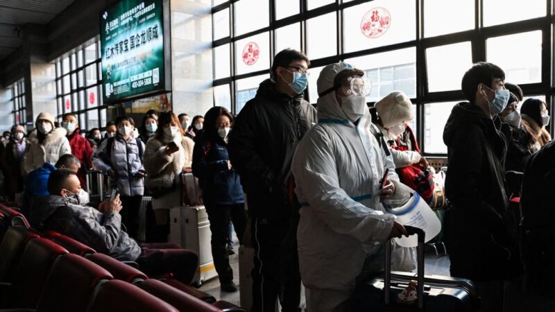 2023 年1月21日,北京黃曆新年前夕,一名穿著個人防護裝備 (PPE)的乘客在北京西站排隊。(NOEL CELIS / AFP via Getty Images)