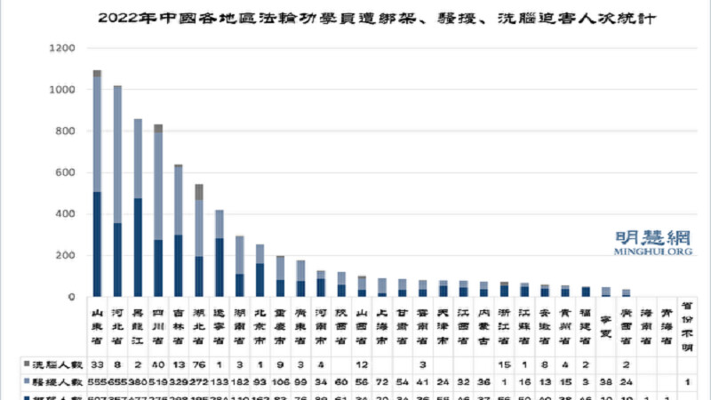 2022年中國各地區法輪功學員遭綁架、騷擾、洗腦迫害人次統計示意圖。(明慧網)
