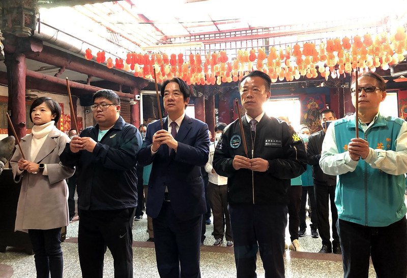 副總統賴清德(圖前中)26日在嘉義縣長翁章梁(圖前右 2)、民進黨籍立委蔡易餘(圖前左2)等陪同下,一起到嘉義縣水上鄉苦竹寺參拜祈福。(圖/中央社)