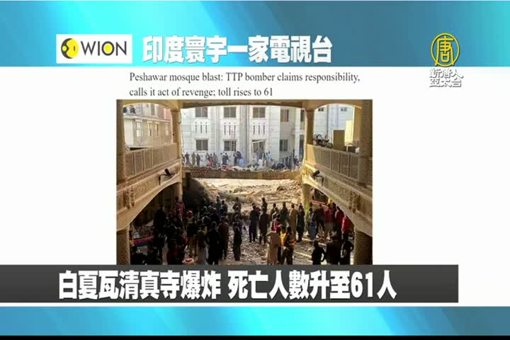 【新唐人亞太台 2023 年 01 月 31 日訊】最後是印度寰宇一家電視台報導:白夏瓦清真寺爆炸,巴基斯坦塔利班運動坦言犯案,死亡人數升至61人。