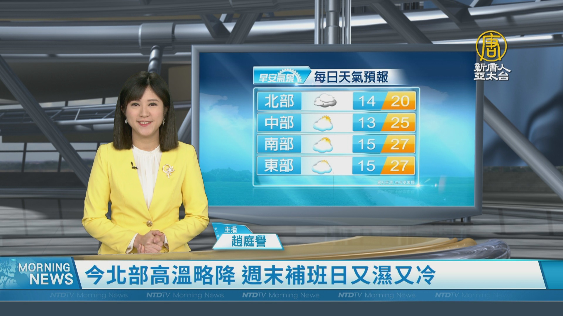 【新唐人亞太台 2023 年 02 月 03 日訊】歡迎您收看2月3日的早安新唐人,我是趙庭譽,先來帶您關心天氣。受到東北季風持續影響,今天北部高溫略為下降,白天北部及宜蘭高溫約18到20度,中部及花蓮高溫約21到25度,南部及台東地區高溫約25到30度,另外,明天星期六是補班補課日,降雨範圍更大,北部、東半部、中部都可能有雨。提醒觀眾朋友留意。帶您一起來看到國際媒體重要訊息。