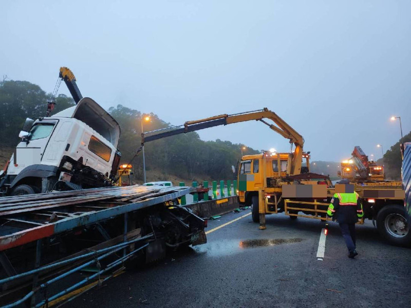 初步了解,貨櫃聯結車失控衝向中央分隔道,後方一輛自小客車閃避不及追撞其掉落的貨櫃,車頭部分導致對向車道2輛車追撞,事故發生後一度占用內側、中線及外側車道,造成車流回堵約1公里,上午8時35分完全排除恢復通車,無人受傷。