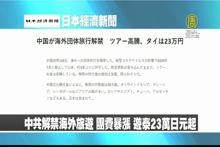【新唐人亞太台 2023 年 02 月 07 日訊】來看到日本經濟新聞報導:中共解禁海外旅遊,首批開放國家包括泰國、印尼等20國,不包含日本、韓國。而團費也暴漲。