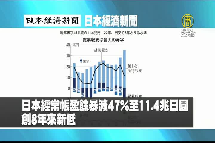 【新唐人亞太台 2023 年 02 月 09 日訊】來看到日本經濟新聞報導:2022年日本經常帳盈餘暴減47%來到11.4兆日圓,創8年來新低。