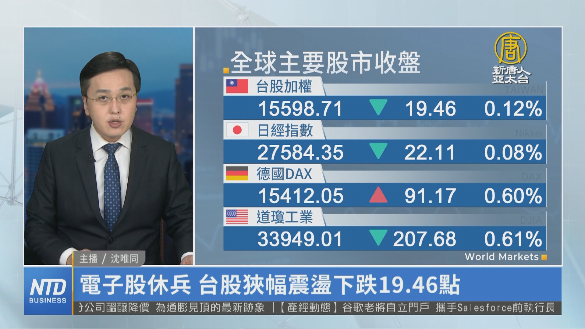 【新唐人亞太台 2023 年 02 月 09 日訊】新聞一開始帶您關心國際股市,美股經過前一天上揚後,市場擔憂終點利率可能高於市場預期,此外Google母公司Alphabet,股價狂跌逾7%,科技股下跌,美股主要指數收黑,費半重挫2%,也影響亞洲股市表現。台股今天狹幅震盪,指數上下區間僅63點,終場以15598.71點作收,下跌19.46點,台積電、聯發科等電子股休兵,傳產漲跌互見。