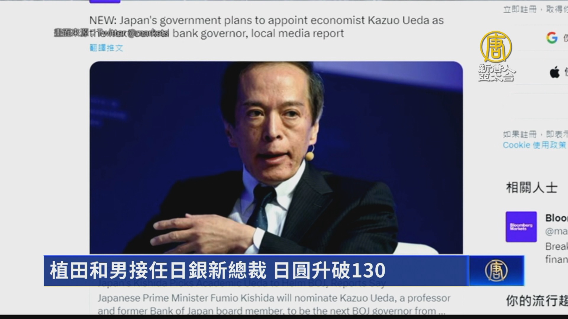 【新唐人亞太台 2023 年 02 月 10 日訊】日本央行總裁黑田東彥任期將在4月8日屆滿,根據日經新聞報導,日相岸田文雄基本決定,起用前日本央行審議委員植田和男,出任下一任央行總裁。副總裁則由前金融廳長官冰見野郎三、日銀理事內田真一擔任。日本政府14日將向議會提交人事案,取得眾議院和參議院同意後任命。消息一出,東京外匯市場日圓匯率,來到1美元兌130日圓。