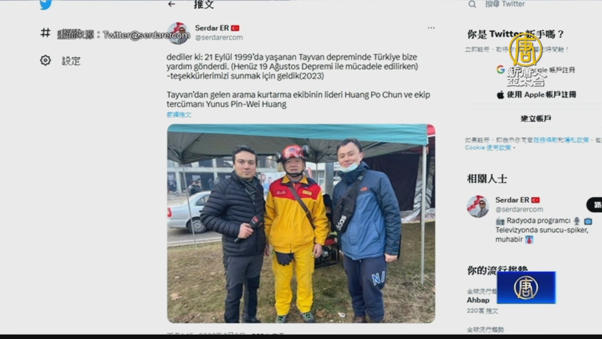 【新唐人亞太台 2023 年 02 月 10 日訊】台灣派遣了130人搜救隊,進入土耳其災區搶救,並捐贈物資、金援支持災區,引起當地媒體及人民相當大關注。土耳其前總理達夫托葛魯,9日晚間在視察阿德亞曼災區時,特地向台灣搜救隊員表達感謝,他感性的說「因為你們來幫忙救援我們的公民,從現在開始,你們就是我們的公民」。當地媒體也爭相報導台灣的總統、政府官員等人士捐出薪水、以及台灣仍謹記1999年921地震土耳其參與救援,如今台灣也對土耳其伸出援手致謝。