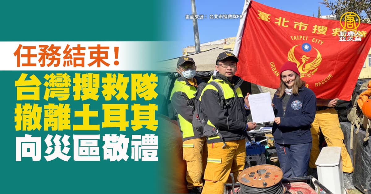 【新唐人亞太台 2023 年 02 月 13 日訊】早安新唐人先帶您關心,土耳其、敘利亞強震發生一個星期,目前死亡人數已經超過3萬人,災區目前進入全面開挖階段,台灣搜救隊昨天傍晚結束搜救任務,130人分批撤離,台灣搜救隊全體列隊向災區致敬,並捐出部分重要器材裝備給災區使用,前往土耳其阿德亞曼機場,全隊預計於星期三15日返國。台北市搜救隊發文寫到,「只要你需要我們,我們立即就來!我們來自台灣」。另外,針對土耳其教授葉瑪思說,看到土耳其消防人員,為了搶功勞、名聲,將台灣搜救隊「客氣地」請走,讓他感到痛心。對此,台灣消防署說考量受災國民風與民情,全力配合,「一切以救災優先,一本初心!」