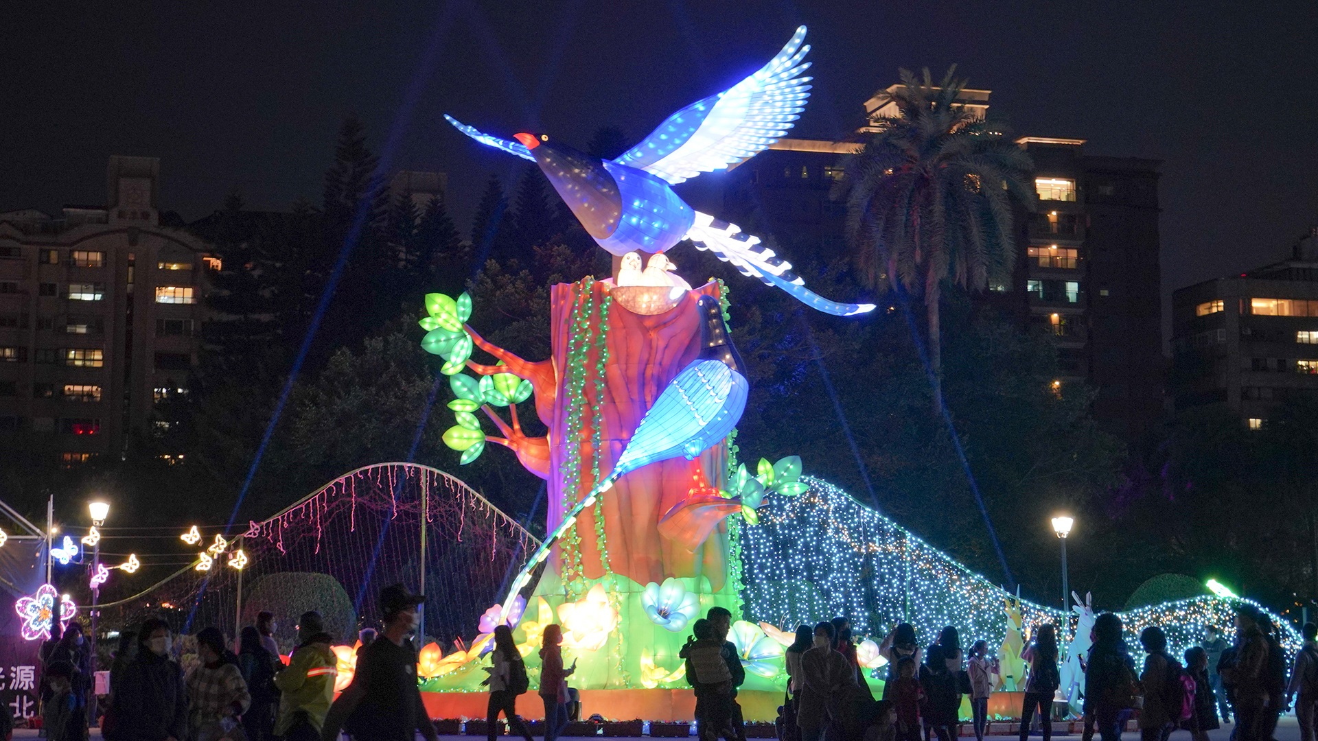 台灣燈會將在19日落幕,台北市政府13日提醒民眾,當捷運國父紀念館站月台人潮壅擠時,就會啟動列車過站不停措施,並提前透過廣播通知列車內及月台上的旅客因應調整。圖為台灣藍鵲主燈照 。(圖/翻攝自光源台北網頁)
