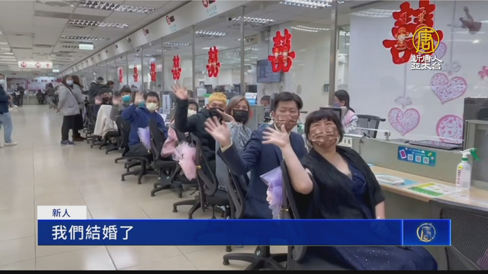 【新唐人亞太台 2023 年 02 月 15 日訊】週二14日是西洋情人節,浪漫節日也讓各地戶政事務所,一大早就湧入不少新人來登記結婚,人口最多的新北市,有高達536對新人完成登記結婚,一個上午就來了165對新人,還有戶政事務所一口氣就開了8個專櫃,來消化人潮。