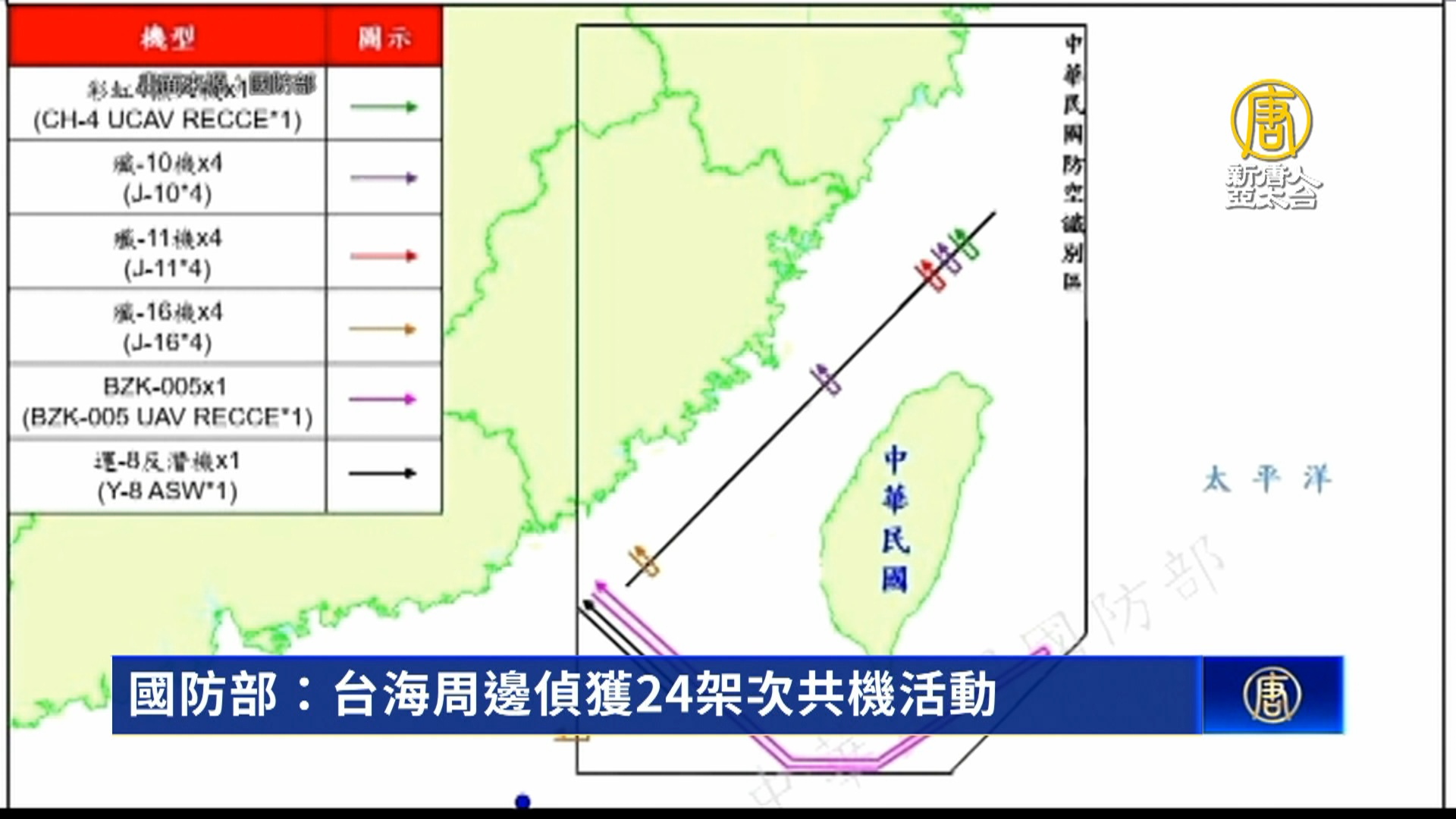 【新唐人亞太台 2023 年 02 月 18 日訊】外媒報導,美國五角大廈負責中國事務的國防部副助理部長蔡斯,17日抵達台灣訪問,當天中共軍機就大舉出海挑釁台灣空防,中華民國國防部表示,截至今天(18日)上午六點,24小時之內,在台海周邊偵獲共機24架次,共艦4艘,其中逾越海峽中線及其延伸線,進入西南空域的共機15架次。包括無人機與多類型戰機,其中一架BZK-005無人機,從西南空域沿台灣南端繞行,直闖東部空域,飛行航線引起關注。國軍運用任務機、艦及岸置飛彈系統嚴密監控與應處。